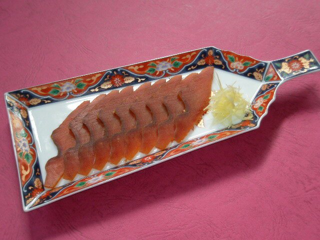 塩引鮭を自然の風で1年かけてゆっくりと熟成させ、薄くスライスしたもので、塩引鮭と並ぶ村上の代表的な鮭料理です。