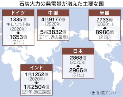 石炭火力の比率が高いインドネシアやフィリピンでも過去最大の発電量となり、厳しい環境規制を敷くドイツでも安定供給を優先して2割強増えています。